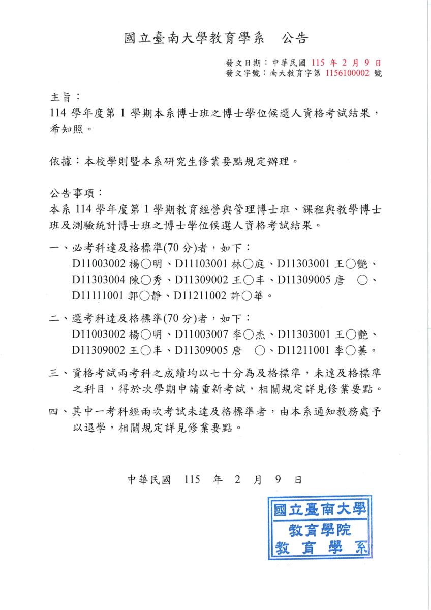114-1博士班資格考考試結果公告