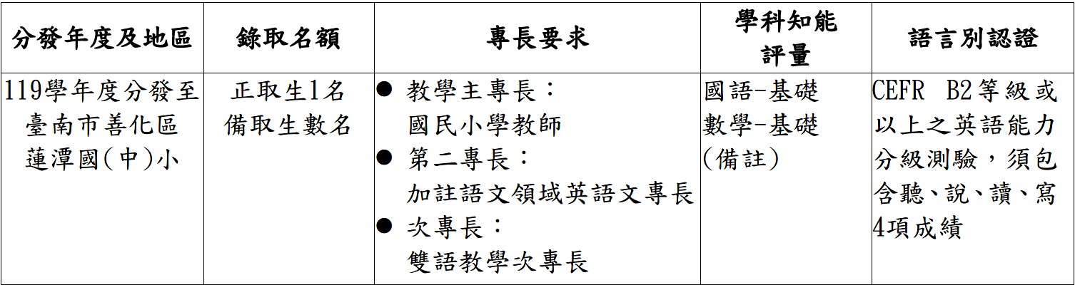 115學年度臺南市蓮潭國(中)小乙案公費生共計1名,甄選、培育及分發之相關資訊詳如附件,歡迎本校有興趣的師資生(含研究所師資生)報名! 詳情請參閱甄選簡章。 一、受領公費時間: 自115學年度起(至少應領滿2學年公費)。 二、甄選時程:
